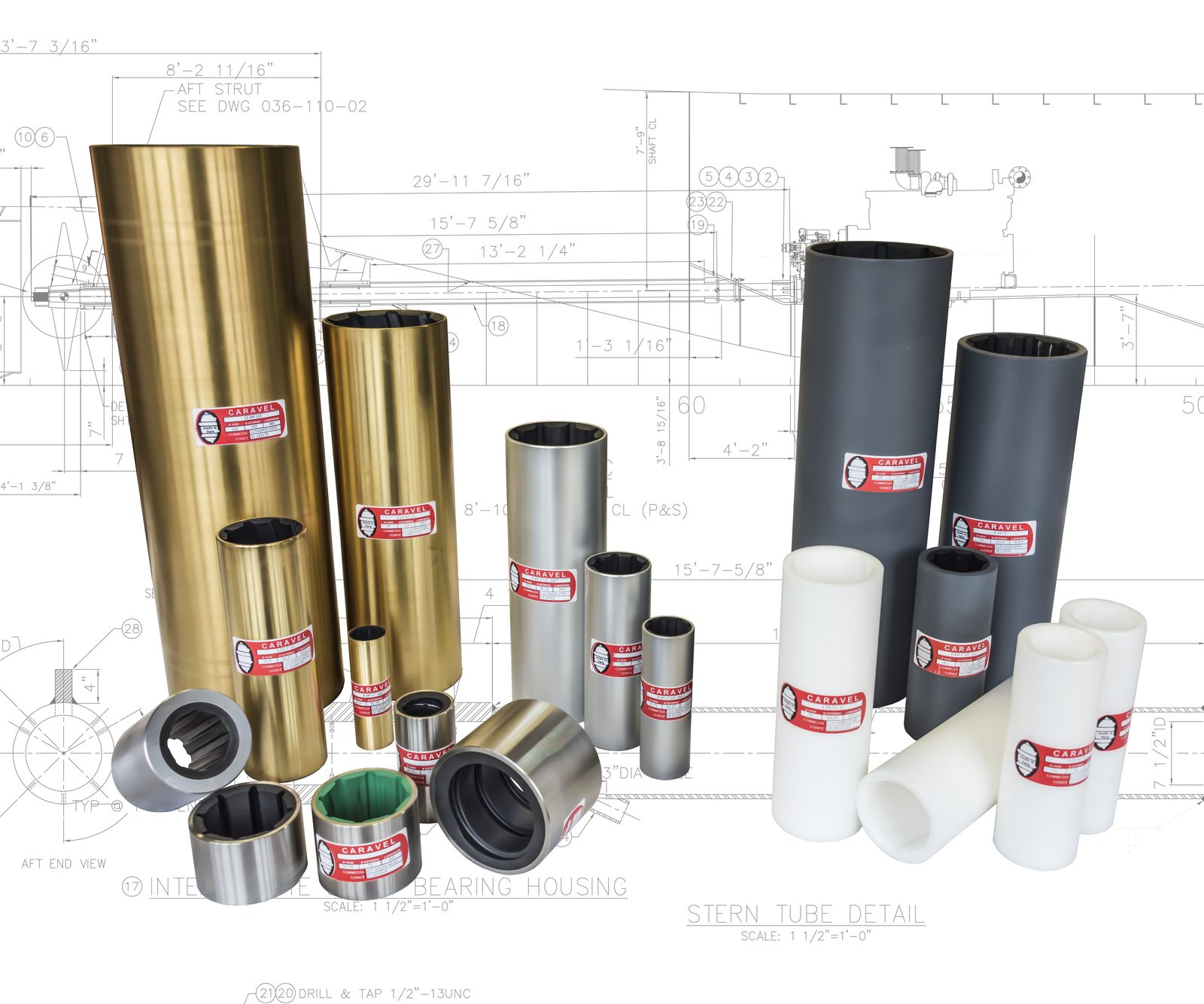 Cuscinetti con guscio esterno in leghe ferrose e non ferrose (inox, acciai, ottone, bronzo) e superficie interna in gomma nitrilica, consentono la lubrificazione con il solo ricorso all'acqua di mare.
