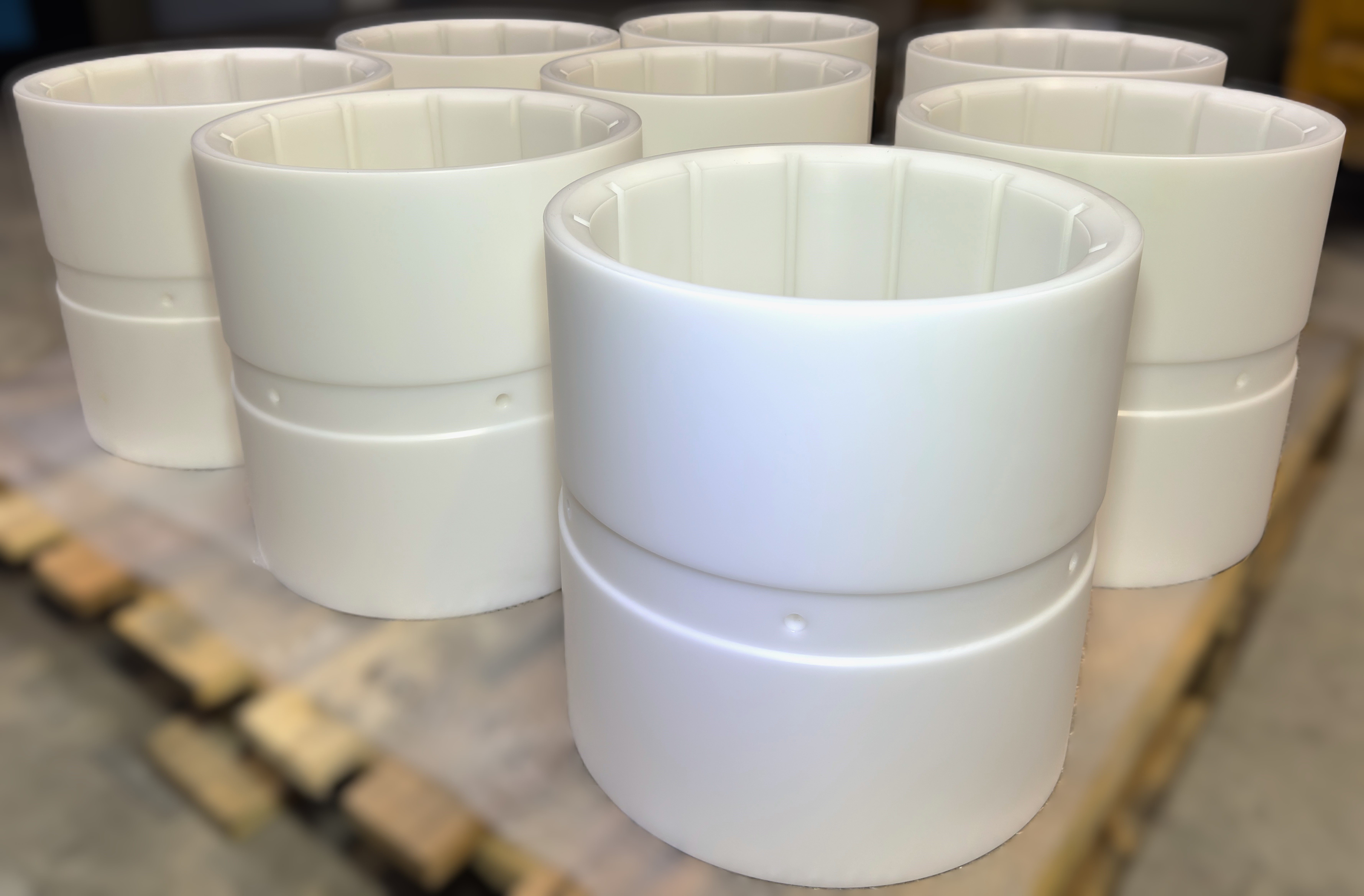 Boccole in polimero cristallino POM-C, conosciuti anche come Delrin, disponibili nelle dimensioni più diverse, da 20 a 300 mm di diametro asse.